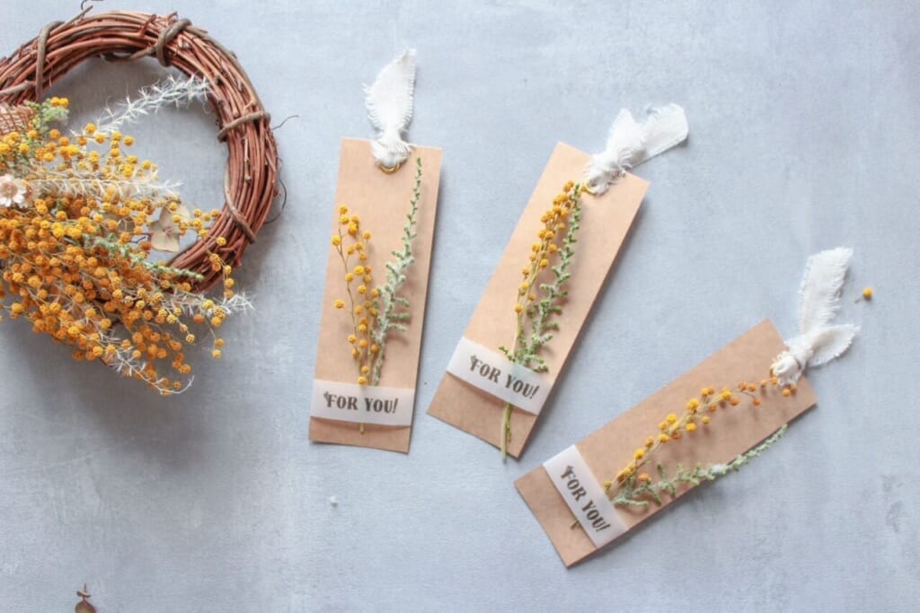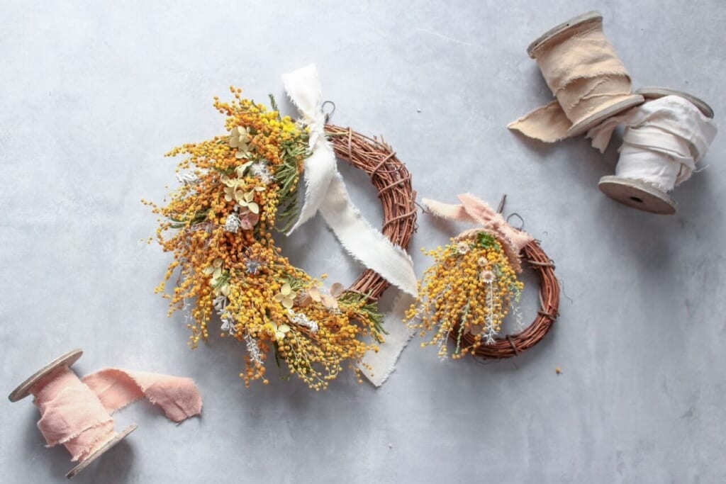 みつば工房では、ドライフラワーを使った商品を沢山販売しています。 最近だと、私は今回販売するミモザのランタン作成に携わりました。ミモザは初めて触ったんですが、とってもふわふわで(笑)。黄色くて可愛かったです。