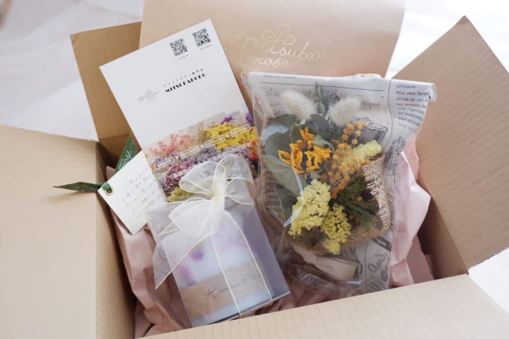 MITSUBAKOBOさんは、障がいをお持ちの方の働き方をサポートする「就労継続支援B型」事業所の「みつば工房」さん併設のドライフラワー専門店です。