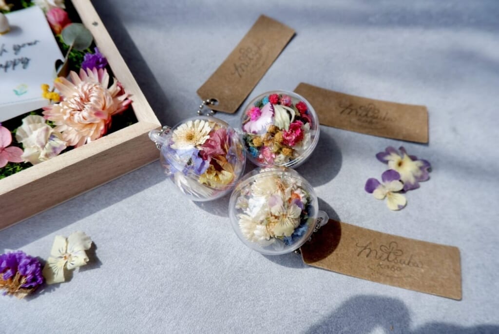 (お花を使ったキーホルダー。同型のものを福岡フラワーショーにて販売予定とのこと)